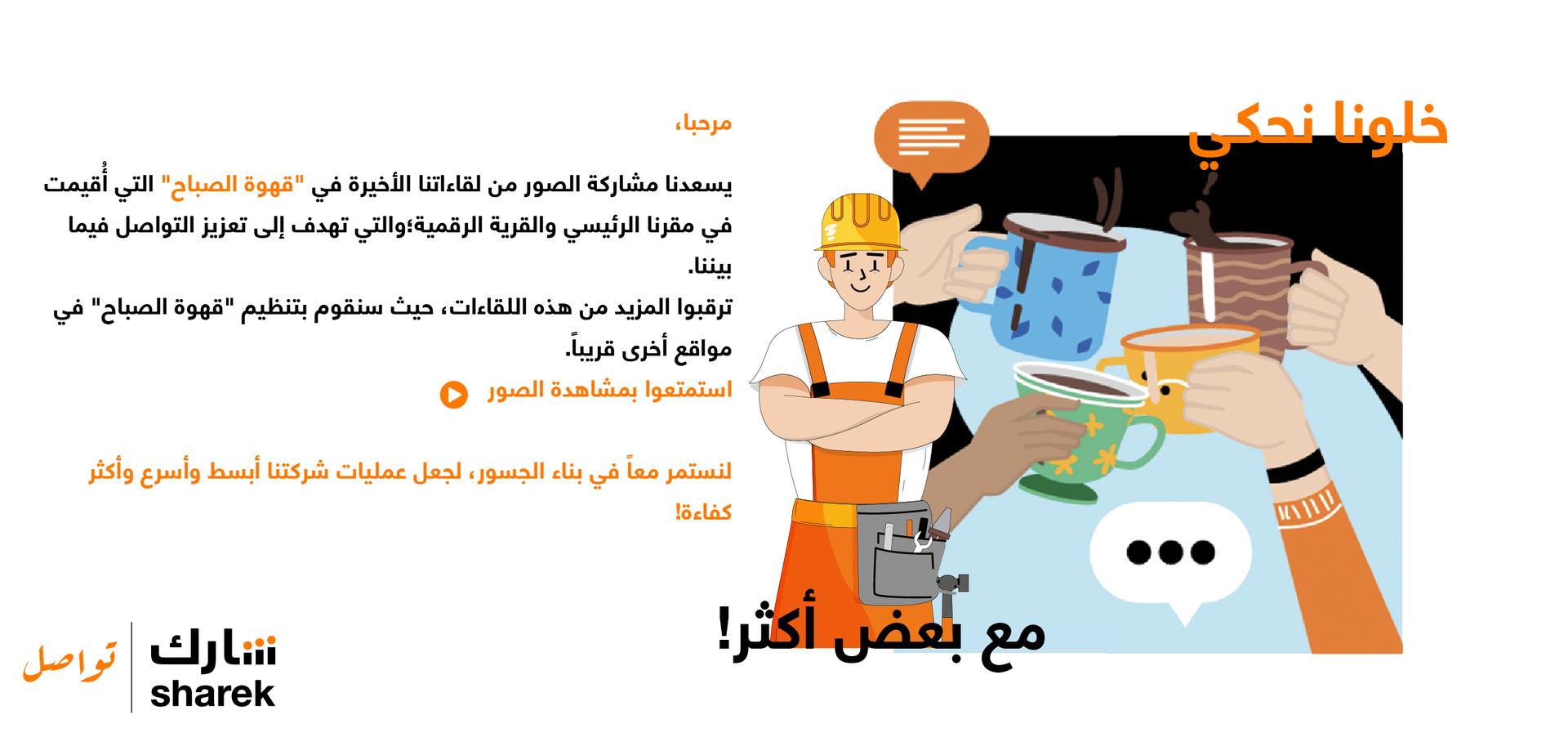 يسعدنا مشاركة الصور من جمعاتنا الأخيرة في "قهوة الصباح" التي أُقيمت في مقرنا الرئيسي والقرية الرقمية؛ حيث تهدف هذه التجمعات إلى بناء الجسور وتعزيز التواصل.