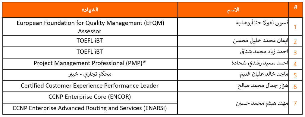 نهنئ زملائنا وزميلاتنا حصولهم على شهادات تخصصية واحترافية في مجال عملهم من مراكز ومعاهد دولية معتمدة، وذلك بعد اجتيازهم للامتحانات المقررة بنجاح.
